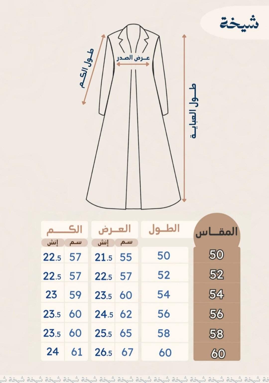 - طول العباية يؤخذ من الكتف الى أسفل الكعبين (من الأمام