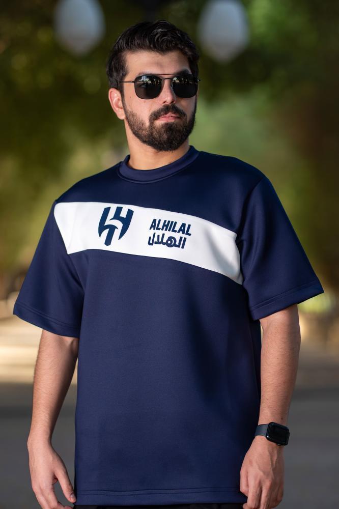 تيشيرت نادي الهلال يتميز بتصميم أنيق وعصري يعكس روح الفريق العريق والانتماء الرياضي بكل فخر. يأتي بلون كحلي جذاب مع شريط أبيض طويل على الصدر يحمل شعار النادي وكلمة “ALHILAL – الهلال” بطباعة واضحة وأنيقة.